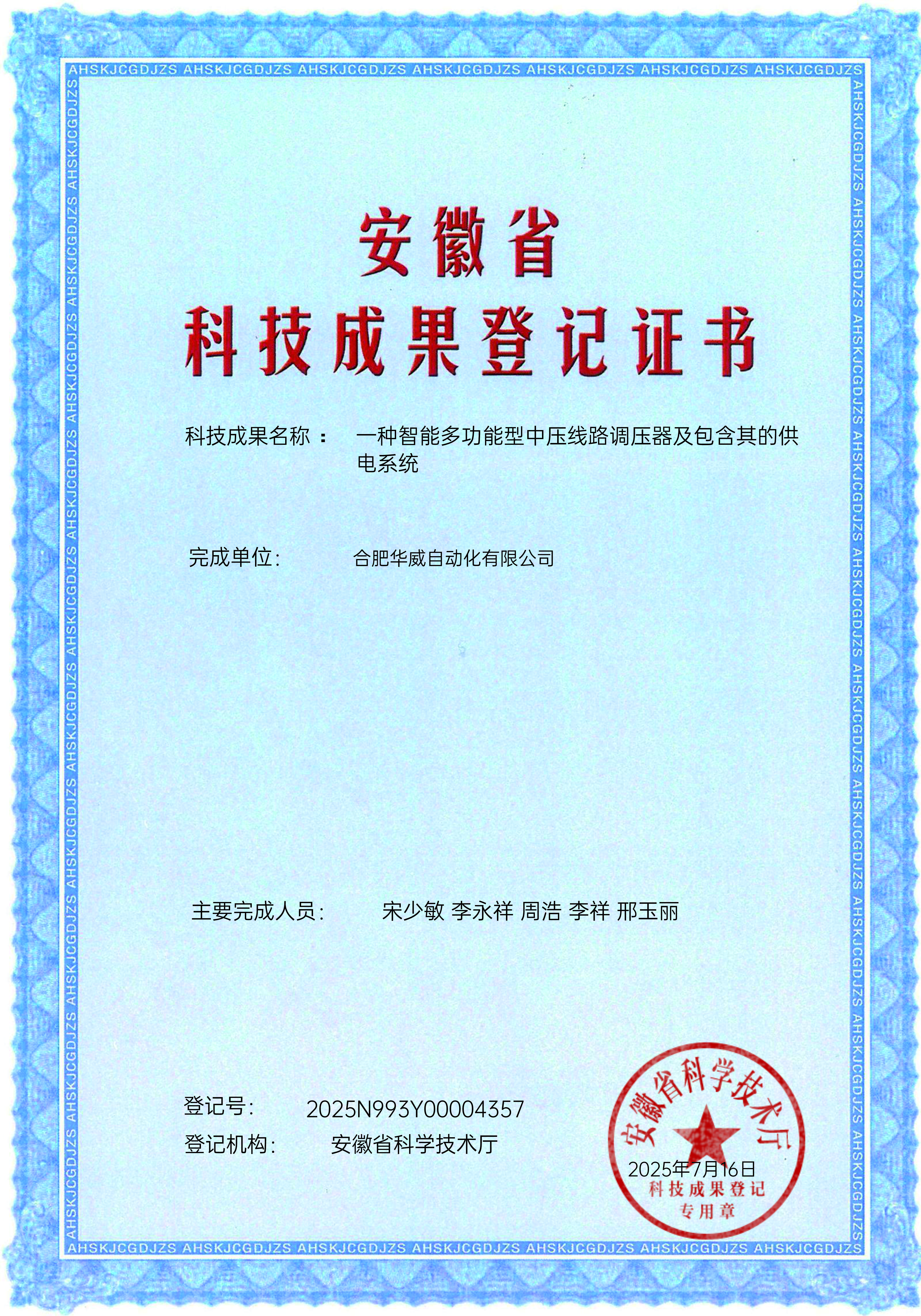 安徽省科技成果登记证书