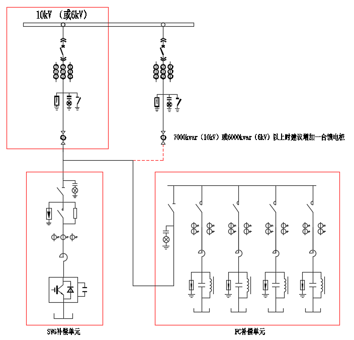 HWTSVG-G动静态协同型无功补偿装置是将高压静止无功发生器SVG和无源FC补偿支路相结合,从而解决FC不能连续无功补偿以及大容量SVG运行高成本的问题。该装置采用统一协调控制,其中FC实现容性无功的大容量分级调节,SVG用以实现感性无功和容性无功快速连续调节,控制系统能有效分配补偿容量,从而实现容量段内的动态补偿。